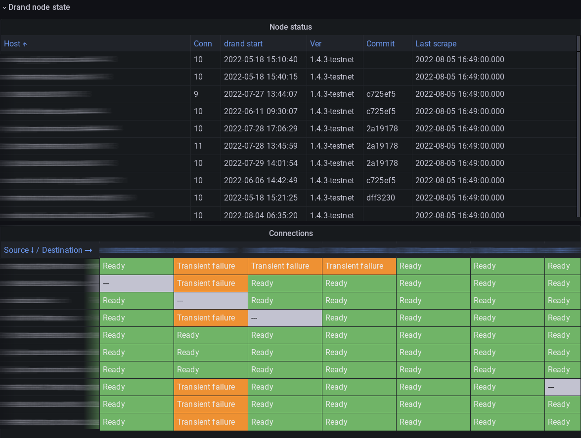 As is usually the case, it took multiple iterations to get to a dashboard design that was useful and also comprehensible. These iterations involved both changing the layout and organization of the presented information, as well as adding metrics that were missed during initial analysis. For example, during ceremonies some of the state changes happen so fast that they were missed by the polling and dashboard refresh intervals, so we added timestamps to be able to see whether a state had changed or not. We also reformulated some metrics labels to reduce cardinality.